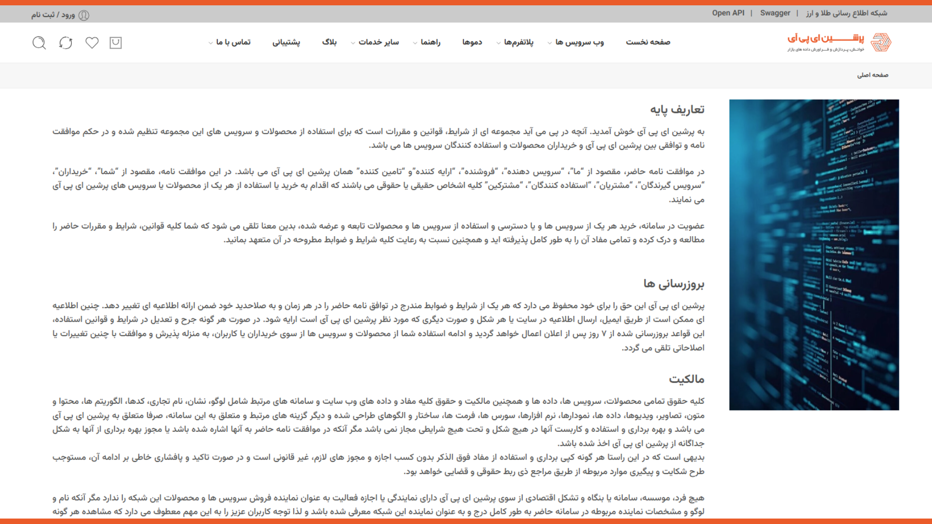 به پرشین ای پی آی خوش آمدید. آنچه در پی می آید مجموعه ای از شرایط، قوانین و مقررات است که برای استفاده از محصولات و سرویس های این مجموعه تنظیم شده و در حکم موافقت نامه و توافقی بین پرشین ای پی آی و خریداران محصولات و استفاده کنندگان سرویس ها می باشد.